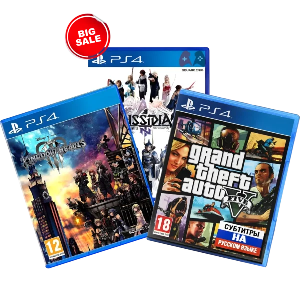 This PS4 game bundle brings together three iconic titles across action, RPG, and fighting genres. Experience the massive open world of Grand Theft Auto V, the magical Disney–Square Enix crossover in Kingdom Hearts 3, and the fast-paced, team-based battles of Dissidia Final Fantasy—all in one powerful collection for PlayStation 4.